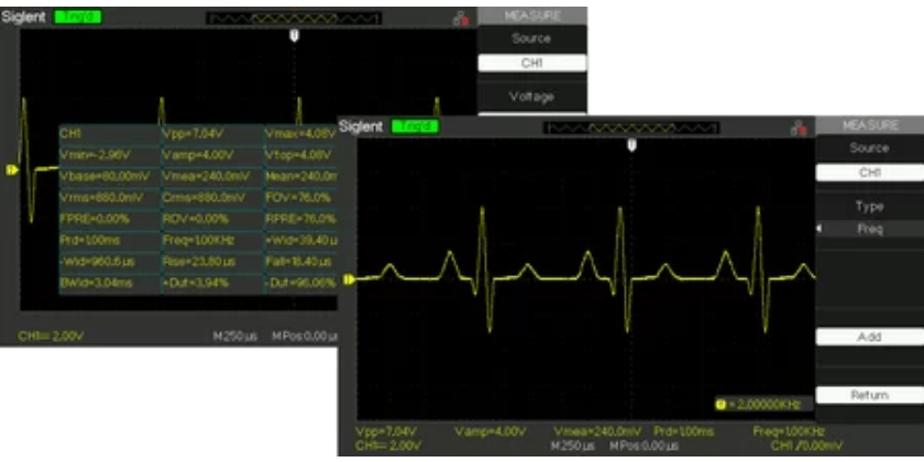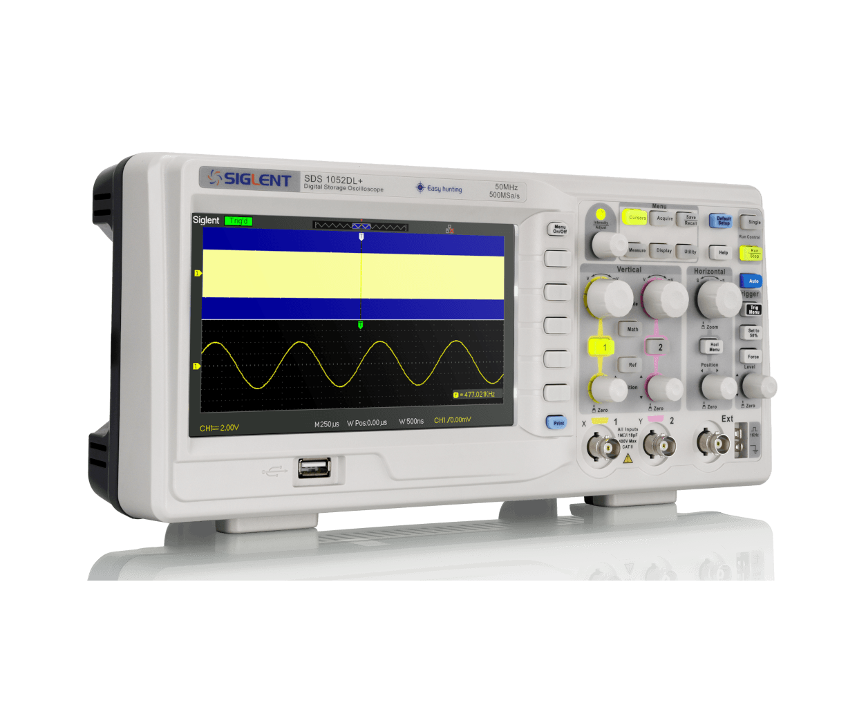 SIGLENT SDS1000DL+ Digital Storage Oscilloscopes are dual-channel, 50 MHz oscilloscopes. The SDS1000DL+ includes a 30 kpts memory depth that helps to ensure accurate waveform resolution and to capture long signal lengths. With its 7-inch TFT-LCD (800*480) screen, there is adequate screen space to help better see and analyze waveform details. Along with a 500 MSa/s sampling rate, the SDS1000DL+ oscilloscope supports 32 parameters measurements and common mathematical operations to speed up complex/repetitive measurements.