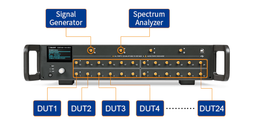 SSM5000A series switch matrix can expand the number of test ports of network analyzer, signal source, spectrum analyzer and other equipment. And the series are with up to 4 input ports and up to 24 output ports, supporting USB, LAN, Direct Control communication modes. The Direct Control interface on the switch matrix can further expand the number of test ports and support a simplified multi-port calibration algorithm, which can greatly improve the efficiency of calibration. In addition to SIGLENT instruments, it also supports other mainstream instruments. It is suitable for 19-inch standard chassis and can be widely used in multi-port test environments such as antennas and 5G component modules.