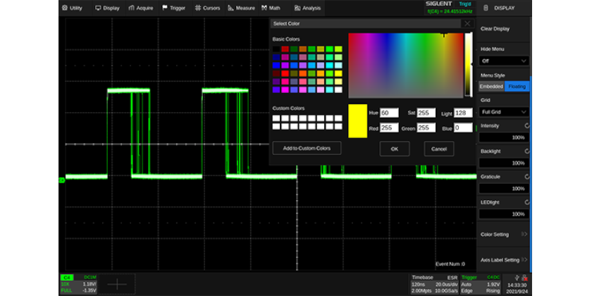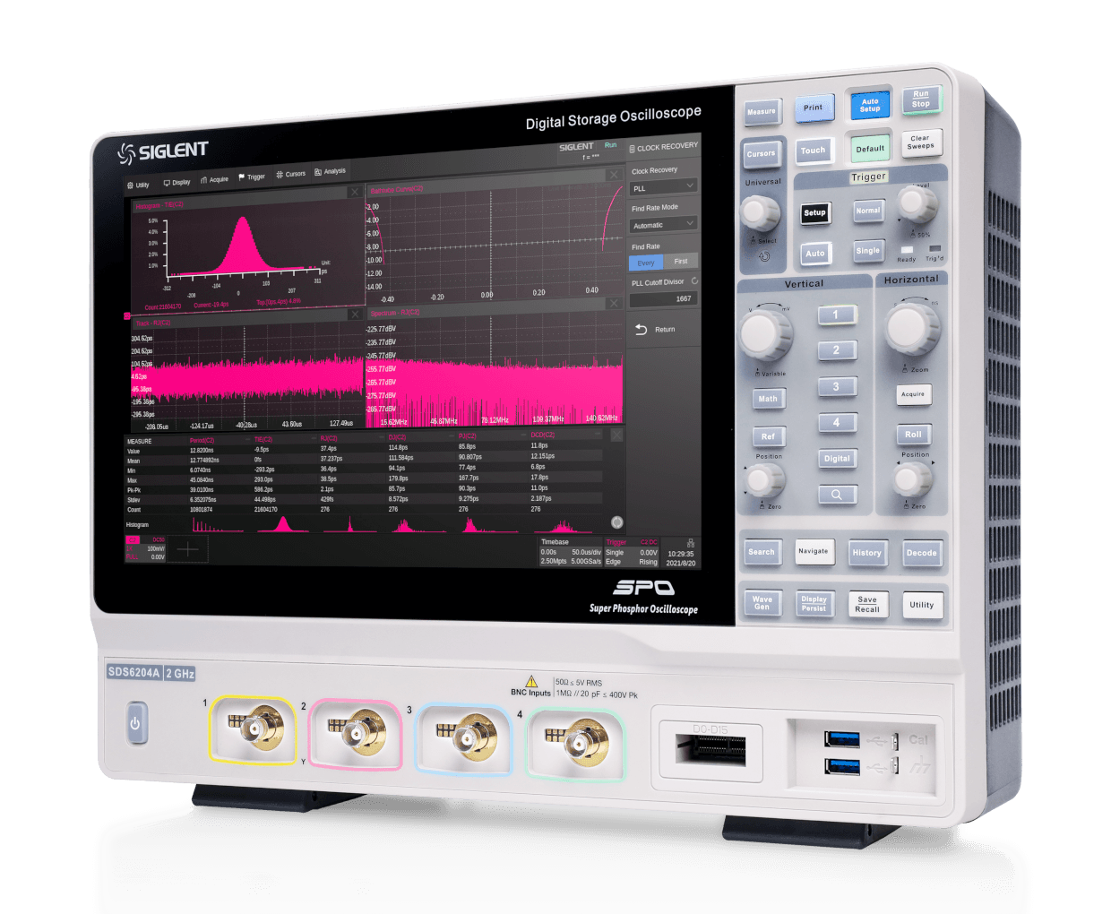 SIGLENT’s SDS6000A series Digital Storage Oscilloscopes are available in bandwidths of 2 GHz, 1 GHz, and 500 MHz, have a sample rate of 5 GSa/s (10 GSa/s ESR) at each channel, a maximum record length of 500 Mpts, and display up to 4 analog channels + 16 digital channels mixed-signal analysis ability.