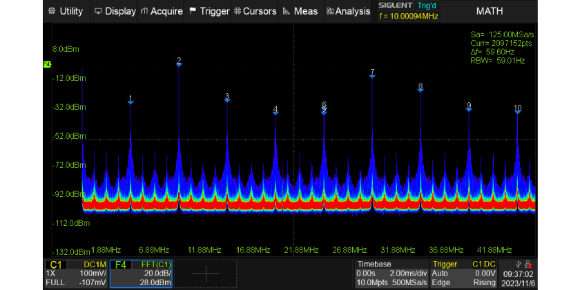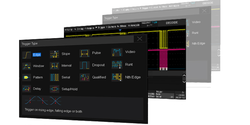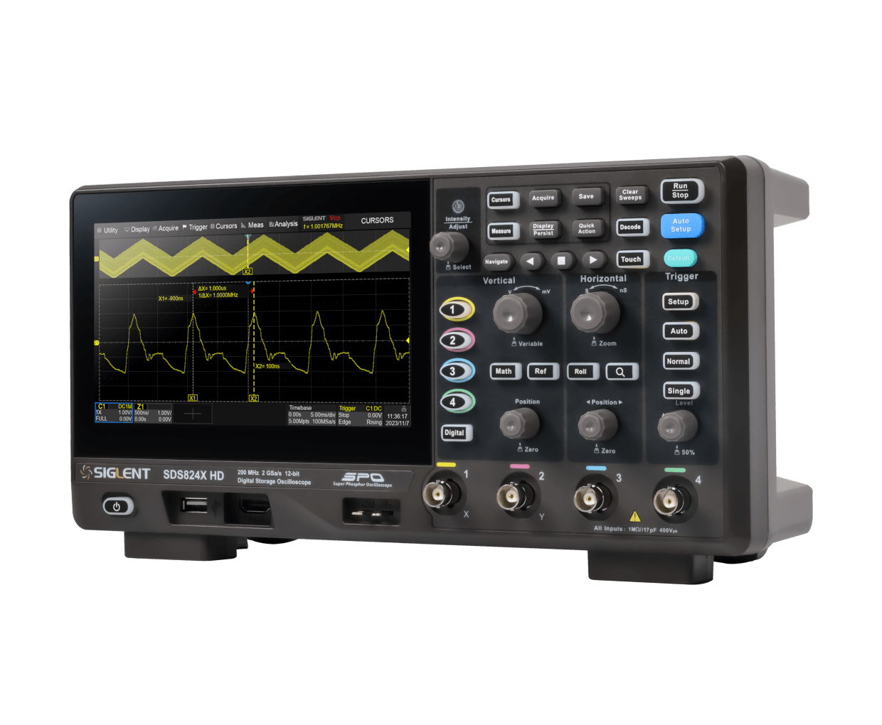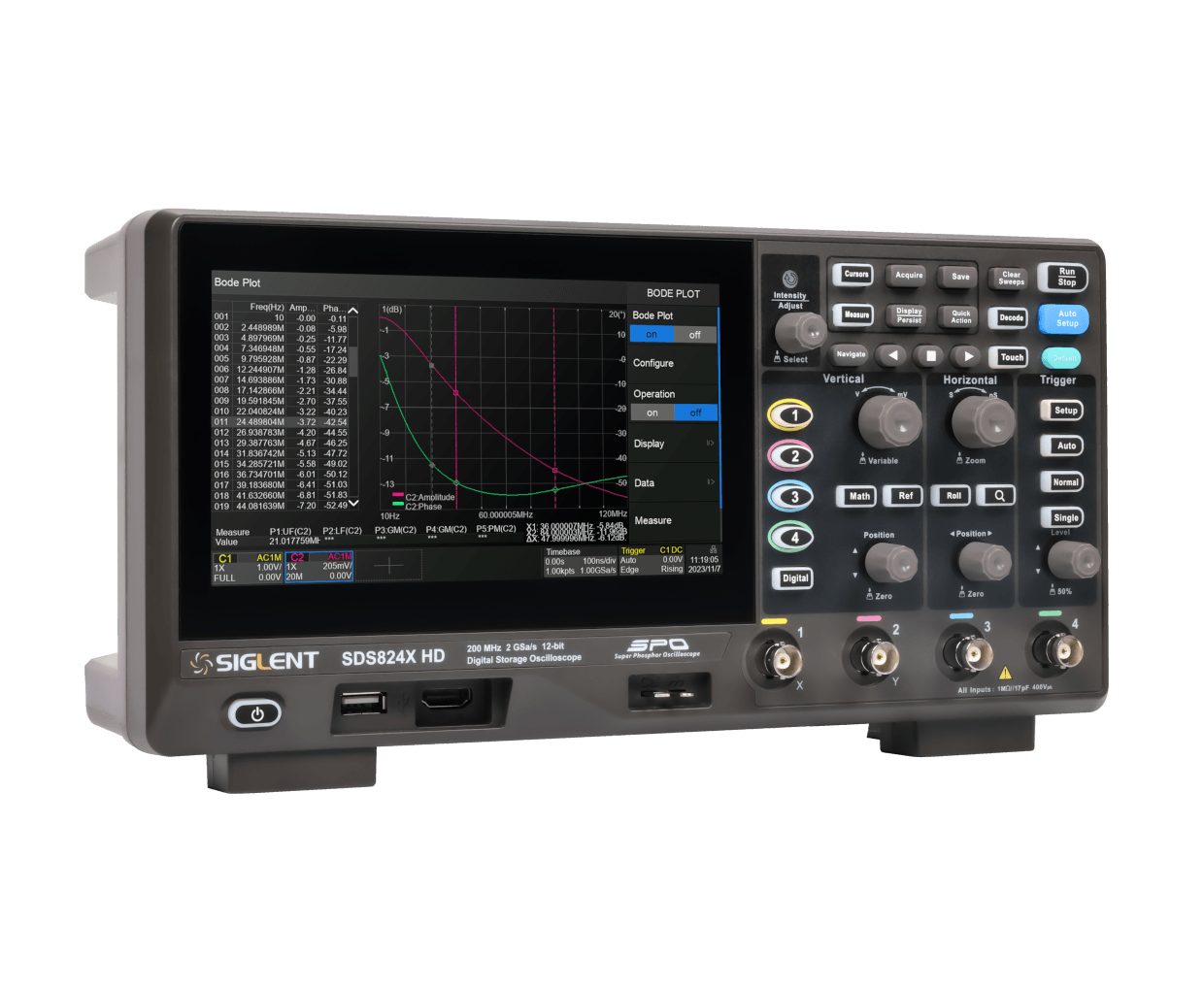 SDS800X HD series oscilloscopes are oriented to high-performance testing applications, providing a bandwidth range from 70 MHz to 200 MHz, and are suitable for testing and debugging of various precision electronic devices. This series also supports 2-4 analog channels, and can be optionally expanded to meet diverse test requirements. Its sampling rate is as high as 2 GSa/s and waveform capture rate is 500,000 wfm/s, which ensures fast capture of transient signals. The vertical resolution of 12-bit, combined with the storage depth of 100 Mpts, brings clear and detailed waveform data to users, and is an effective assistant for engineers to design circuits and troubleshoot.