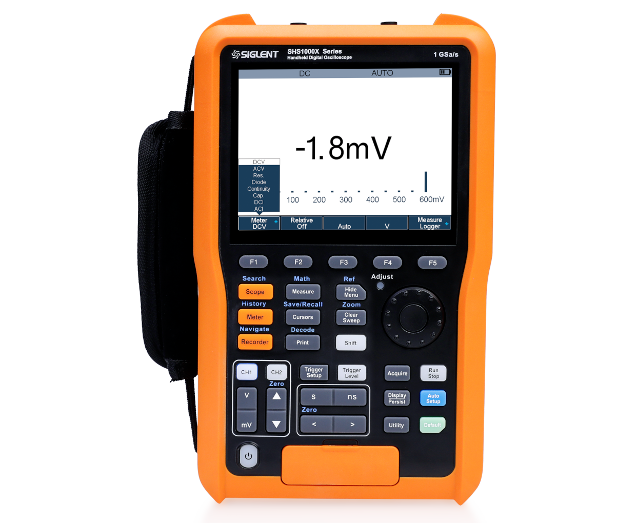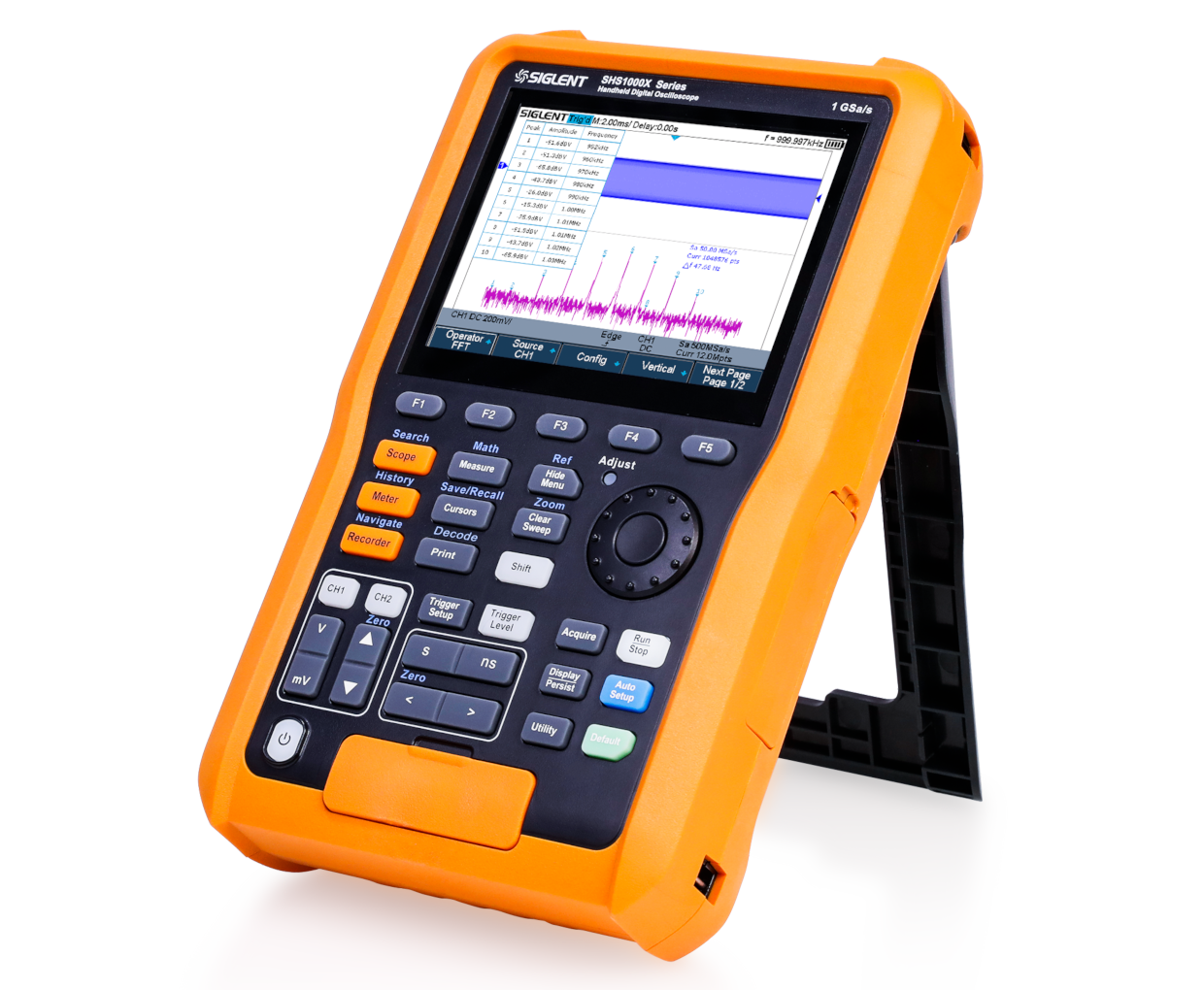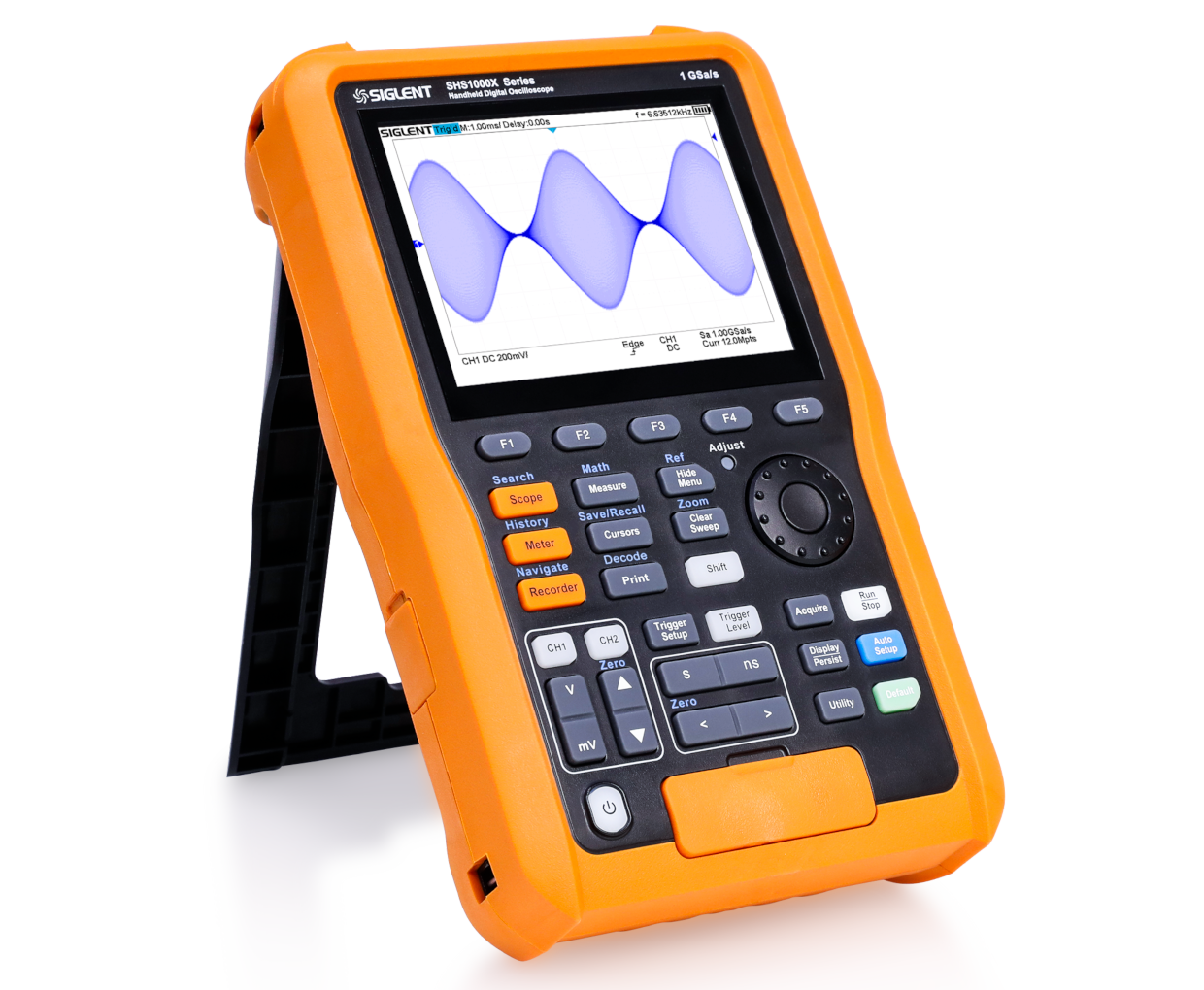 SHS1000X series is a high-performance hand-held oscillograph carefully built by SIGLENT, which provides wide-band selection from 100 MHz to 200 MHz to meet diversified measurement requirements. Its unique double isolated channel design ensures the safety and accuracy in the measurement process. With a real-time sampling rate of up to 1 GSa/s and a storage depth of 12 Mpts, it can capture the rapidly changing signal details. Combined with the built-in multimeter function and recorder, SHS1000X series has become a right-hand man for engineers to conduct on-site testing and analysis, helping to improve work efficiency and accuracy.