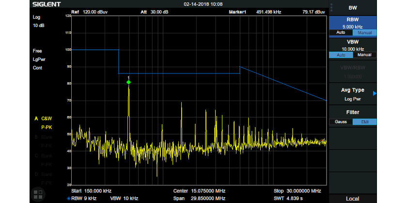 · EMI pre-compatibility test: logarithmic frequency axis and limit line are standard, and EMI filter and quasi-peak detector can be optional.