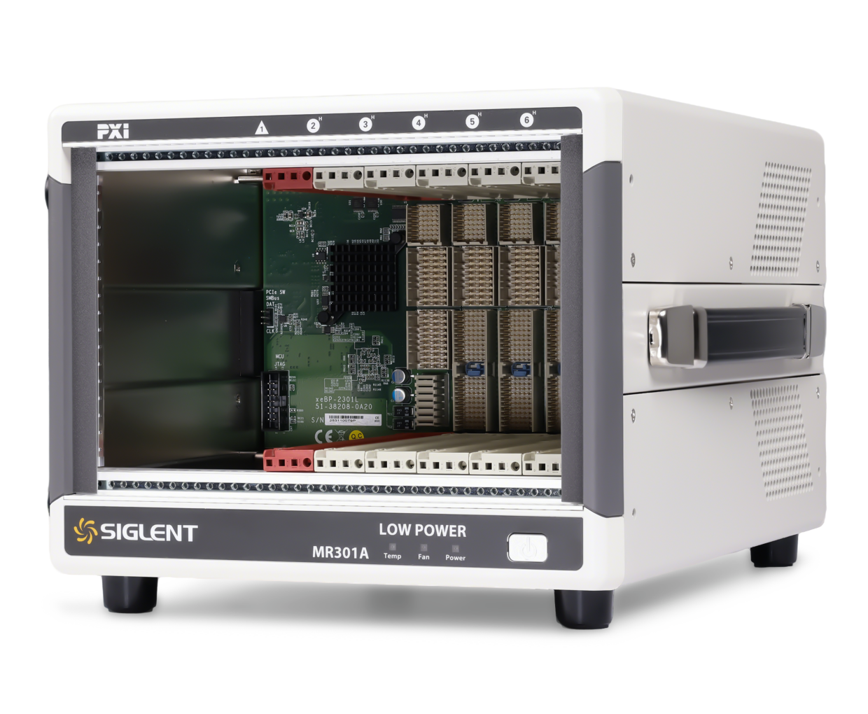 MR301A 3U 6 槽PXIe全混合机箱,提供1 个系统插槽和 5 个混合外设插槽,支持多种带宽增强的测量测试应用。 提供高达8GB/s的系统带宽和2GB/s的插槽外设带宽,其外设插槽全部采用PCIe gen2×4 连接。采用了智能的系统监控控制器,可以监控全部的机箱状态(包括风扇转速、系统电压和内部温度等)。