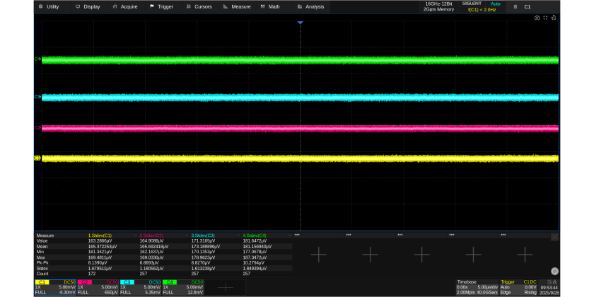 SDS8000A系列采用高性能硬件架构,四通道均可实现176 μVrms(typ.)的超低本底噪声,匹配12-bit高分辨率性能,大幅降低仪器自身对微小信号的干扰,确保产品在高带宽、高速采样的条件下依然能够还原波形特征,确保工程师在精密测量及前沿科研应用中获得高保真波形。